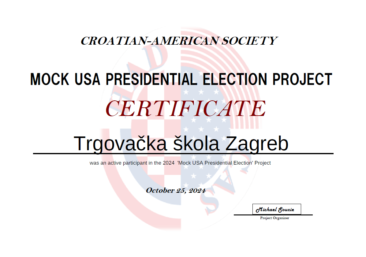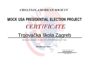 Učenici 1.D, 1.Ck i 3.Ak razreda mogu se pohvaliti sudjelovanjem u svojim prvim političkim izborima, no ne onim pravim, već lažnim izborima za američkog predsjednika unutar projekta koji svake četiri godine organizira Hrvatsko-američko društvo sa sjedištem u Zagrebu. Projekt lažnih izbora za američkog predsjednika provela je profesorica Ivana Obradović u sklopu nastave Engleskog jezika. Prije samog glasanja koje se odvilo 25. listopada 2024. godine, učenici su saznali pregršt informacija o izbornom sustavu elektorskog kolegija koji se koristi u SAD-u za izbor predsjednika te su također dobili uvod u glavne teme rasprave koje su im pomogle u odabiru za kojega kandidata glasati – za Kamalu Harris ili Donalda Trumpa.